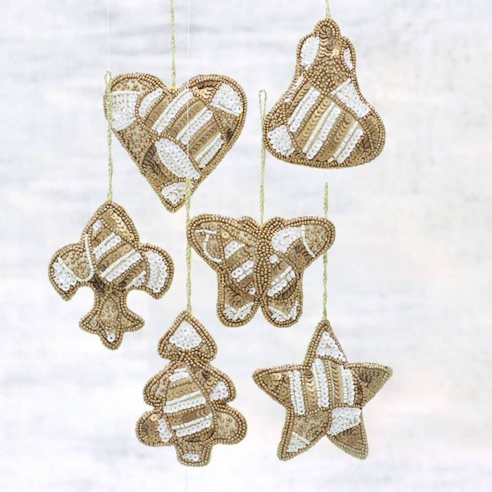 Set of Six Beaded Christmas Ornaments in Gold and White 'Christmas Party in Gold' Item ID: 2671791445