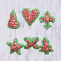 "Six fantastic Christmas ornaments are crafted of soft polyester material and decorated by hand with little beads in colors of red and green to hang from silvery zari thread. Designed by India's Sonia, the ornaments include a fleur de lis, a star, a butterfly, a Christmas tree, a bell, and a heart. The ornaments arrive in a red velvet pouch."
