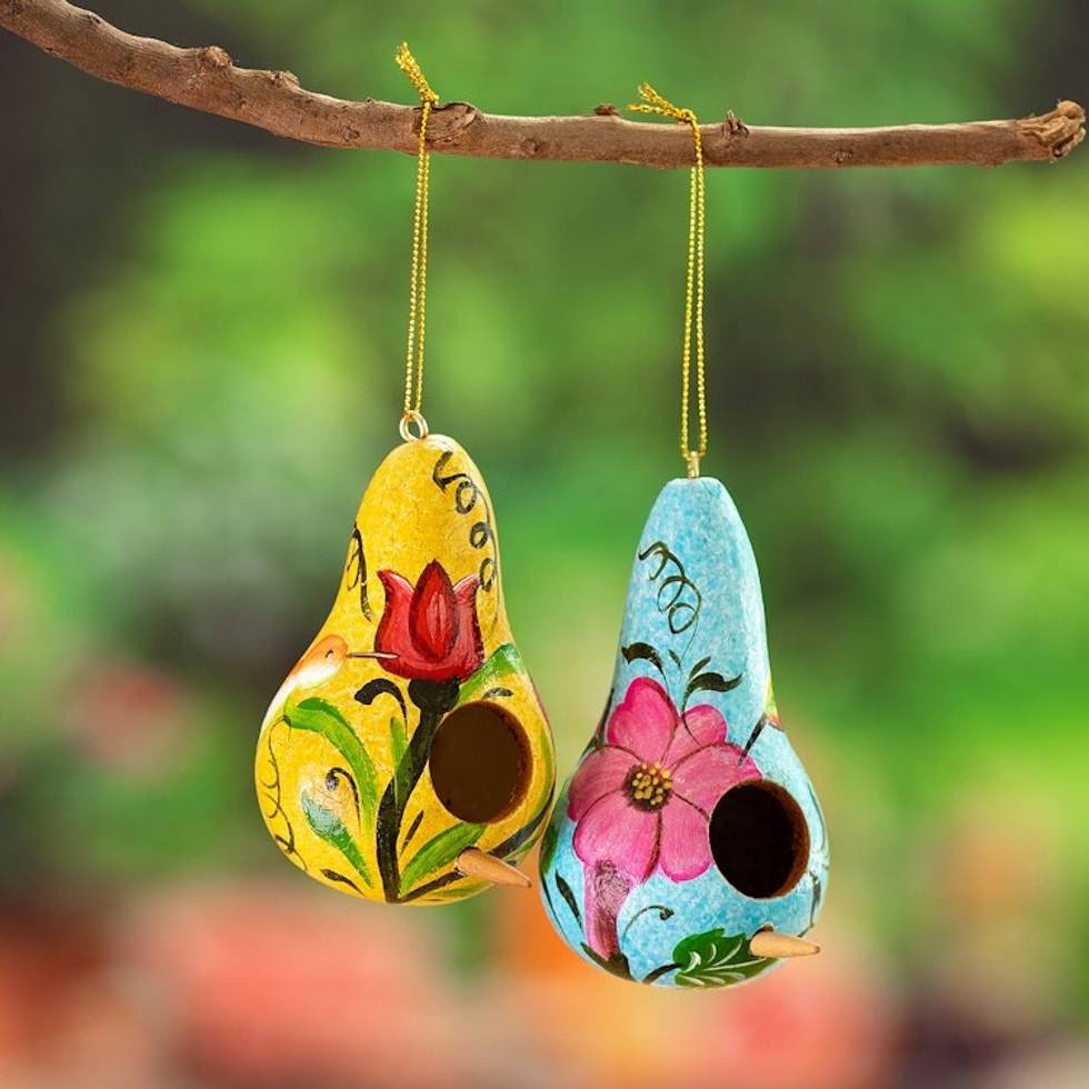 Set of Two Floral Yellow and Blue Dried Gourd Ornaments 'Summer Homes' Item ID: 2669909231
