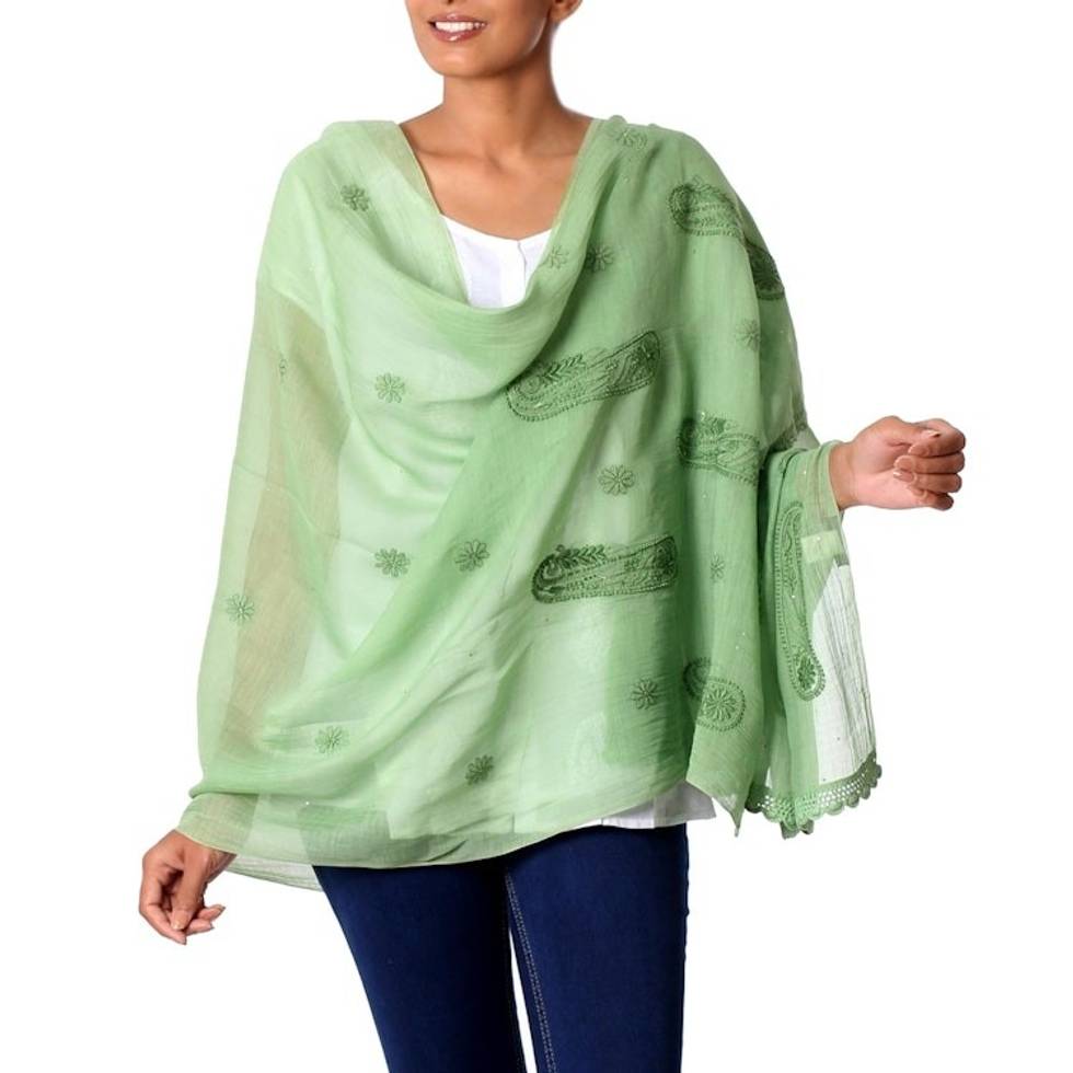 "Ethereally lightweight and sheer, this leaf-green paisley shawl from Uma Tripathi features chikankari, or hand embroidery of a style originating in Lucknow. In chikankari, the fabric is first block-printed with the desired pattern, and then the design is embroidered by hand over the printed areas. The artisan further adorns the cotton and silk blend wrap with kamadani, in which flat gold or silver metallic wire is used to create small dots or floral motifs. The ends of the shawl are crocheted by hand."