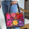 Floral Cotton Accent Leather Handbag from Mexico 'Bouquet of Flowers'