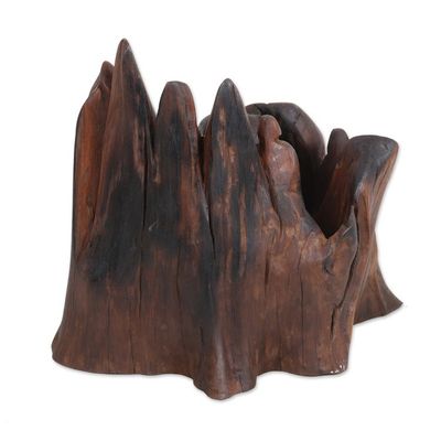 Hand Crafted Wood Sculpture from Indonesia 'Toward the Sky Brown Yoga Cat'