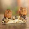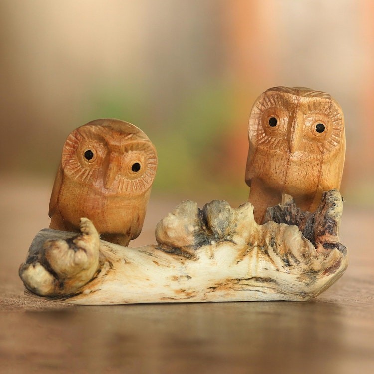 Fair Trade Wood Bird Sculpture 'Crested Owl'
