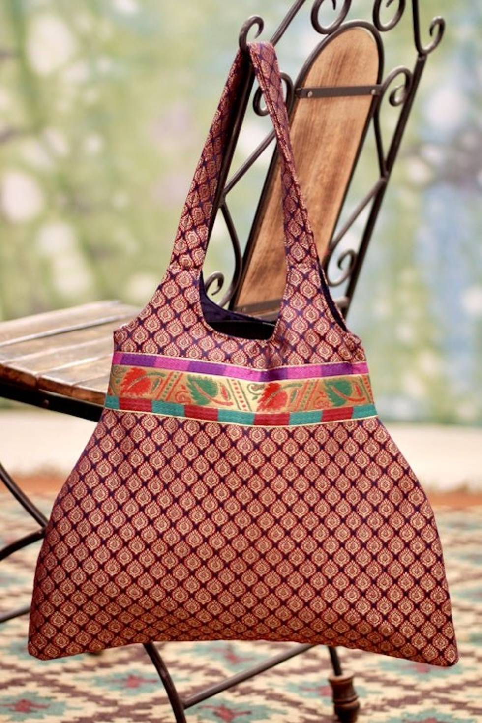 "Golden lotuses are underscored by rich purple in the design of this shoulder bag by India's Om Prakash. The versatile bag is lined in indigo blue, has an inner pocket and closes with a zipper. The front is adorned with a lavish zari brocade featuring floating leaves."