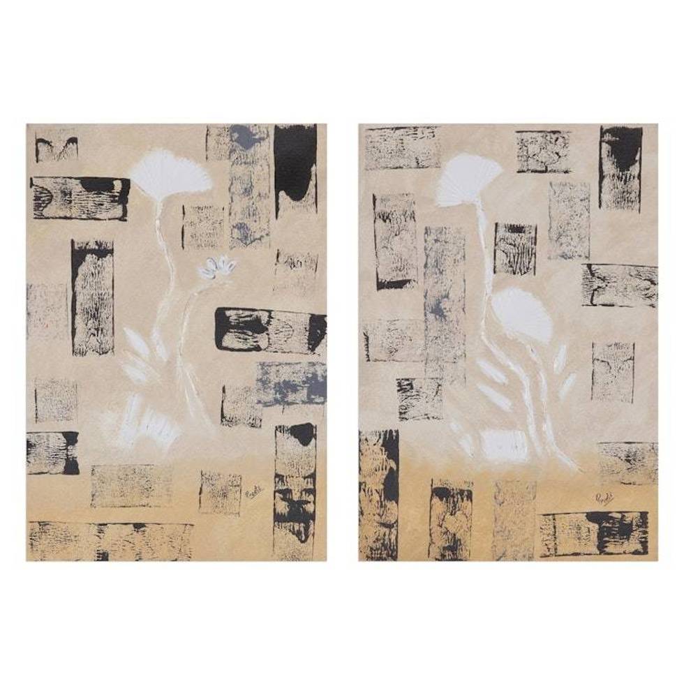 Signed Abstract Diptych in Beige from India 'Floral Symphony' Item ID: 2676665304