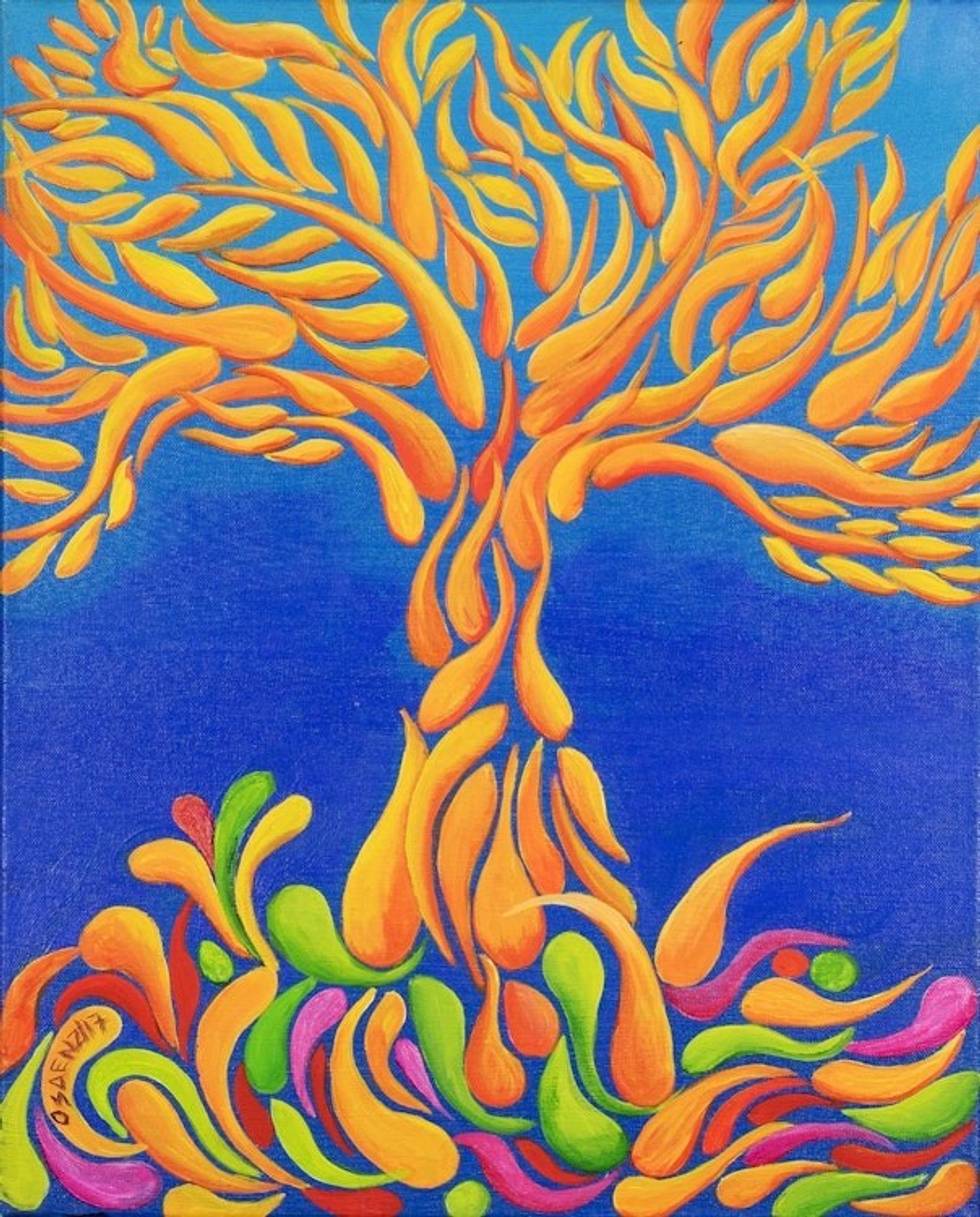 "In this painting, Costa Rican artist Olga Saenz Carbonell imagines the movement of sperm as it seeks to create life. She manifests that theme of life with the image of a tree, which is creatively formed by colorful sperm cells in vibrant colors of orange, yellow, green, and fuchsia. Says the artist, 'Yellow is a vibrant color; the background is cold. It contrasts with the motion of life, with its fruits and beauty. Below, the force of the earth and life courses through the tree and its roots and insinuate a colorful garden.'