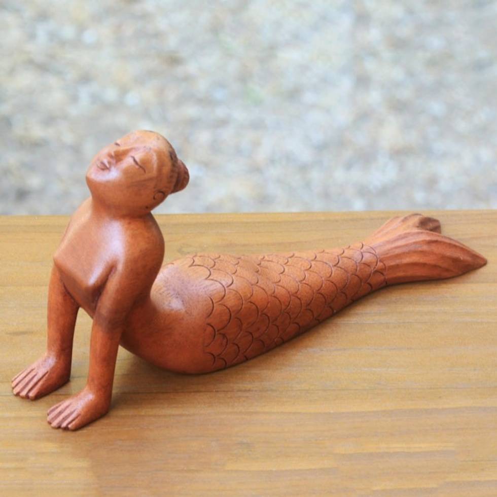 Signed Artisan Carved Mermaid and Yoga Theme Wood Sculpture 'Bhujangasana Mermaid' Item ID: 2671821557