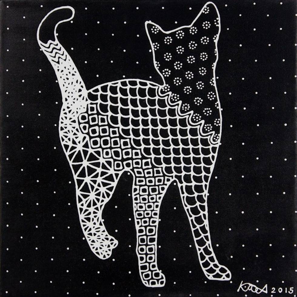 Signed Black and White Acrylic Painting of Cat from Thailand 'Happy Cat' Item ID: 2669889067