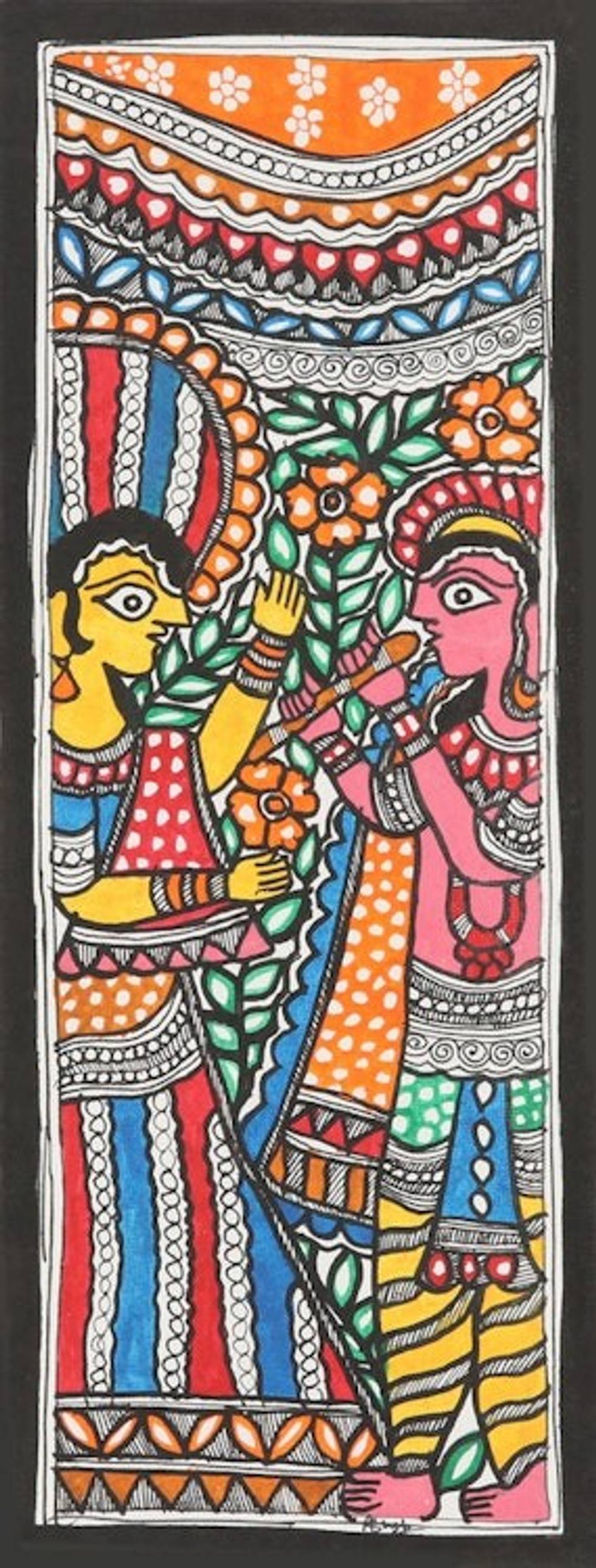 Signed Colorful Madhubani Painting of Radha and Krishna 'Divine Love' Item ID: 2671788038