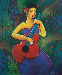Signed Expressionist Acrylic Painting of Woman and Guitar 'Music Expression of the Heart' Item ID: 2671765136