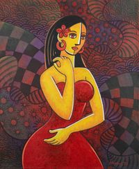 "Inspired by the resilient and tender soul living inside each woman in the Javanese region, artist Harman works with warm hues and acrylic on canvas to create this expressionist composition as an homage to feminine power. The artist uses delicate and sharp brushstrokes to portray a woman in a red dress, showcasing the beauty of the island's people and customs.