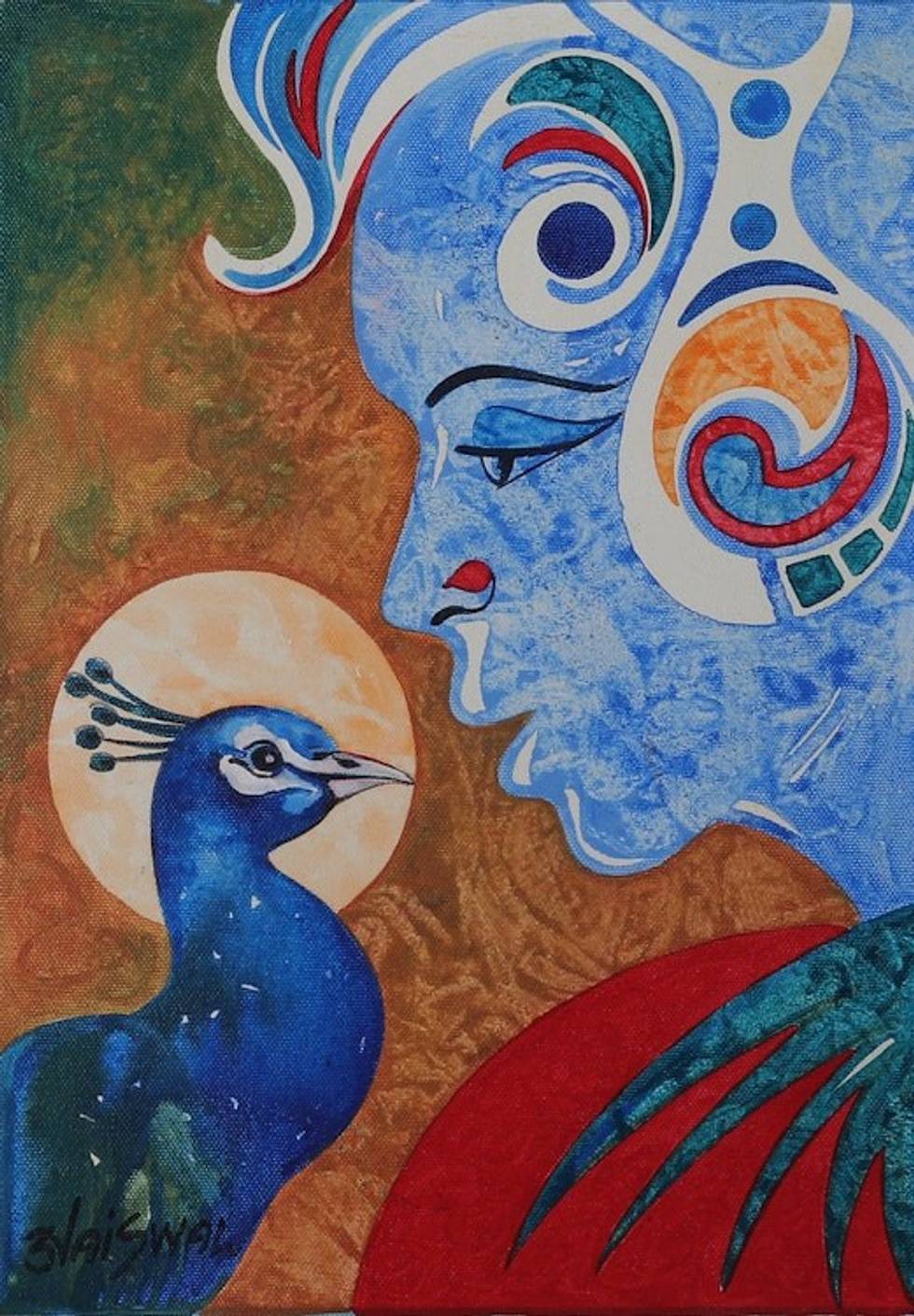 "Vasundhara, the goddess of wealth, prosperity and abundance, blesses the Indian region with her bright aura of divine energies. Artisan Sunil Jaiswal works with acrylic to create this sublime expressionist painting, depicting the deity with a peacock, a symbol of majesty and divinity.