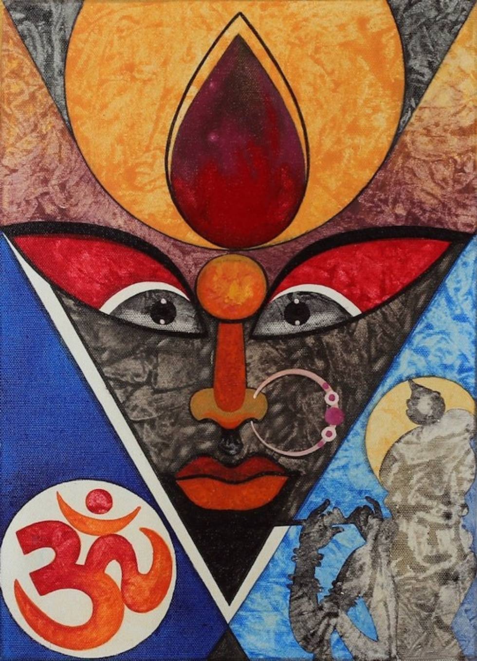 "The goddess of time and death, Mahakali, reigns over the universe in its eternal cycle of rebirth. Powerful and magnificent, the deity poses for a sublime expressionist composition by India's Sunil Jaiswal, who uses bold hues and acrylic brushstrokes to create this captivating homage to this sacred soul of tenderness and mysticism.