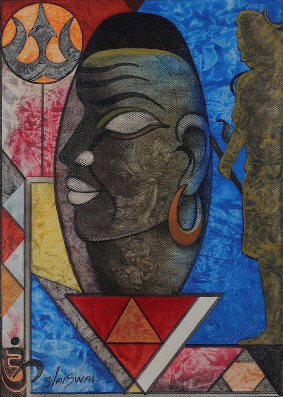"The death of his beloved Sita transformed Shiva into the ferocious Virabhadra, a spirit born from sadness and wrath. Made as a reminder of how emotions transform people, Indian artist Sunil Jaiswal portrays the serene side of this fiery soul in this expressionist composition made with acrylic hues.