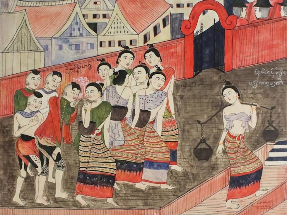 "After graduation, I became an art teacher for the children in my hometown. This makes me look back to my childhood and my early interest in folk art. Even if an image is simply flat and two-dimensional, I can discern the way of life and beliefs of its era. I traveled across northern Thailand in order to study the temple wall paintings that deteriorate with time. I copied them and developed the themes by combining the images with traditional folk arts to create my own unique textures and stories.