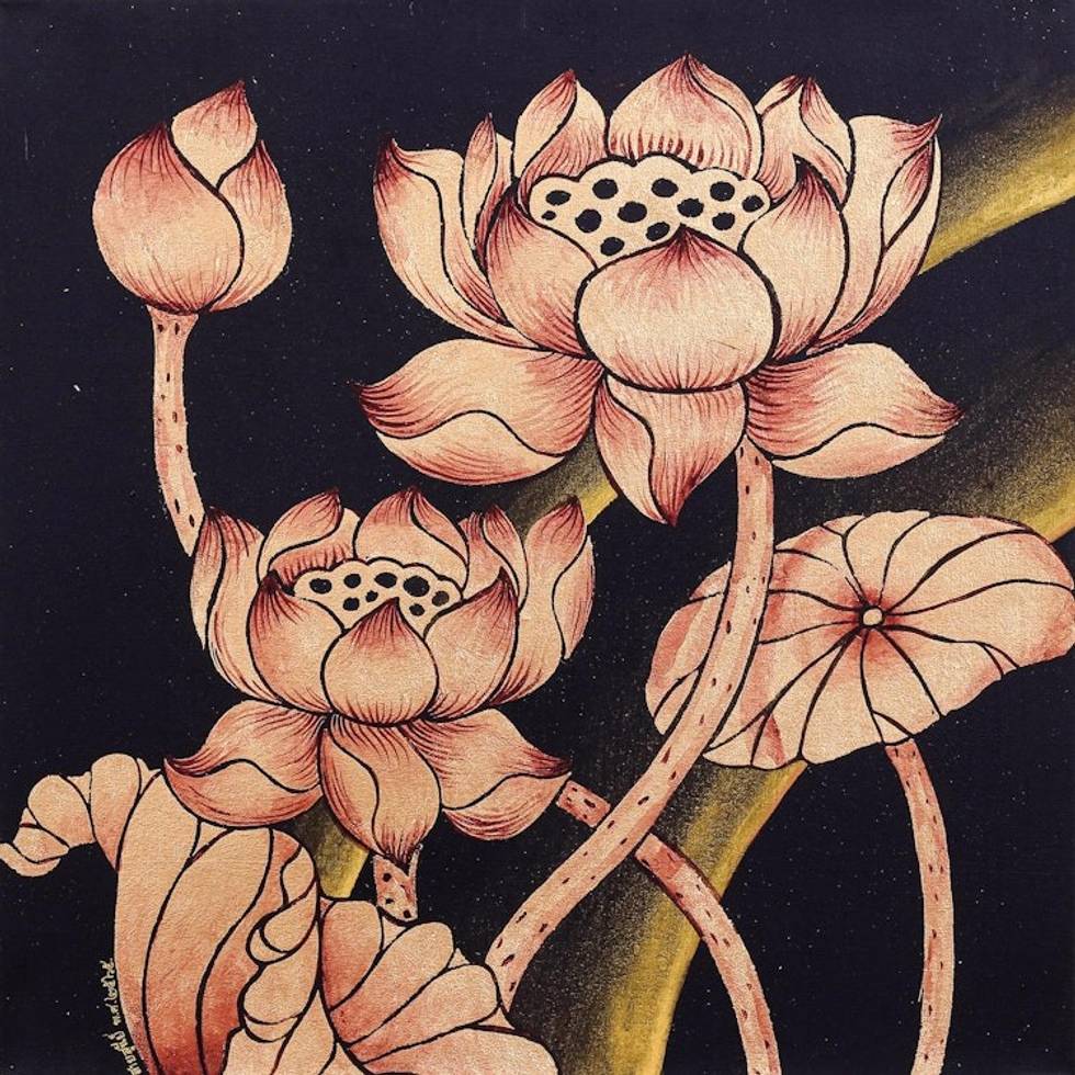 Signed Folk Art Painting of Thai Golden Lotus Blossoms 'Peaceful Lotus III' Item ID: 2669889001
