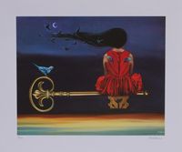 "According to Mexican artist Laura Villanueva, this surrealist composition explores concepts of reflection and dreaming. A girl in a red dress sits atop a giant key that floats, accompanied by a charming bluebird. The pair are framed against an otherworldly, cosmic background, and a flock of birds materializes from the girl's hair. Making an imaginative and thought-provoking addition to your home, this work is offered as a limited edition giclee print.
