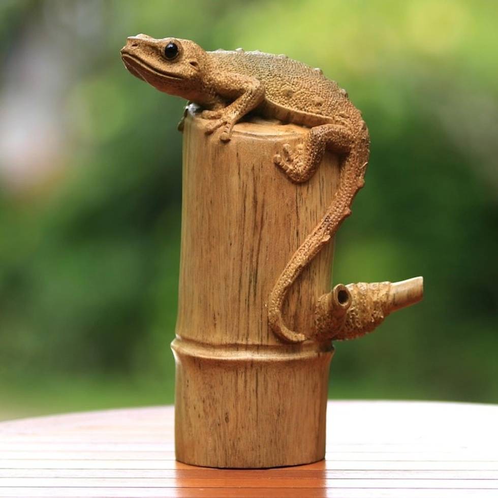 Signed Hibiscus Wood Sculpture of a Gecko from Bali 'Tokek on a Log' Item ID: 2671735590