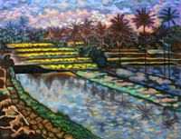 "At sunset, the beautiful waters, trees, and paddies of Tanggayuda village in Ubud, Bali are captured in this beautiful landscape painting by Nyoman Tomblos. Working in what he refers to as a 'semi-pointillist' impressionist style, the artist paints with a vibrant, dreamlike color palette as he allows hues and forms to blend together like a mirage."