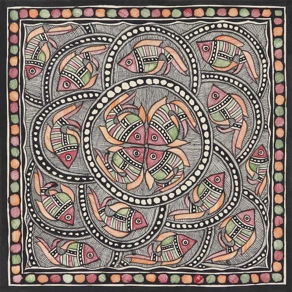"Working in the original style of Madhubani paintings from the Mithila region of India, Devendra Kumar Jha and Family create a stunning piece of art. In a mandala style, vibrant fish form a swirling pattern. Every step of the process is performed by hand, from painting the composition to crafting the paper."