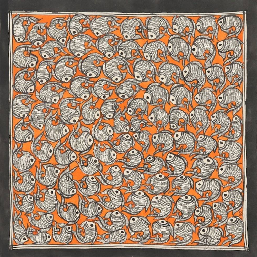Signed Madhubani Painting of Fish over Orange Background 'Fish Tale II' Item ID: 2671789242