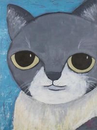 Signed Naif Painting of a Grey and White Cat from Thailand 'Grey Cat' Item ID: 2669889097
