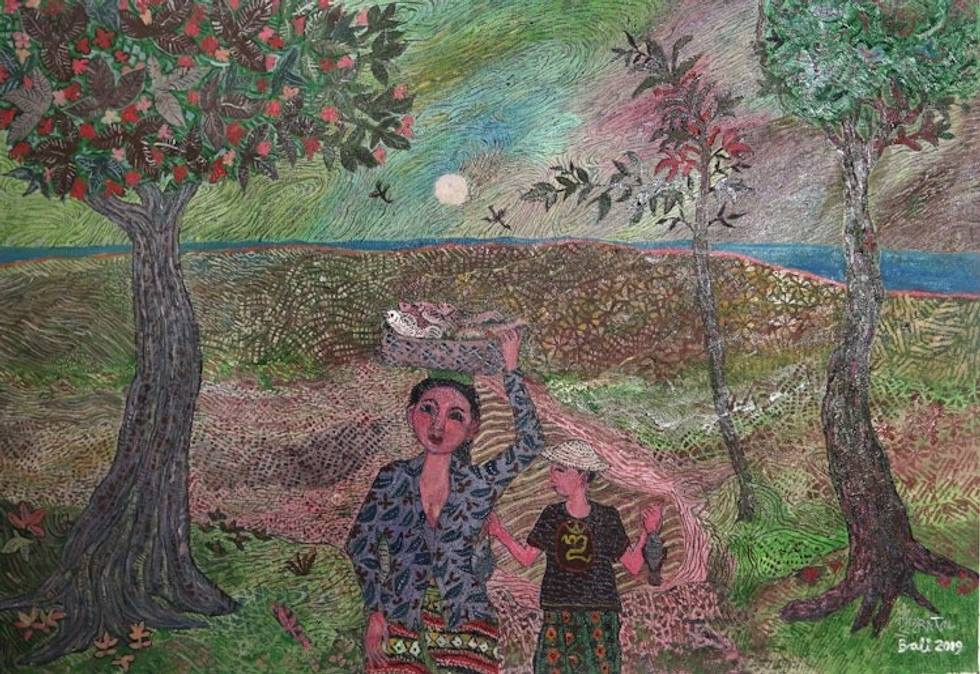 "Says Balinese artist Made Surita, 'A mother with her son are carrying fish caught by her husband. The fish will be cooked for their meals and some of them are also to be sold. That is one role of a mother in a family.' He paints this scene in a charming naif style, capturing the duo against a Balinese landscape lush with trees, grasses, and a river.