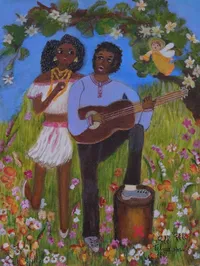Signed Naif Portrait Painting of a Couple in Love 'Flower of the Pequi Fruit' Item ID: 2669890330