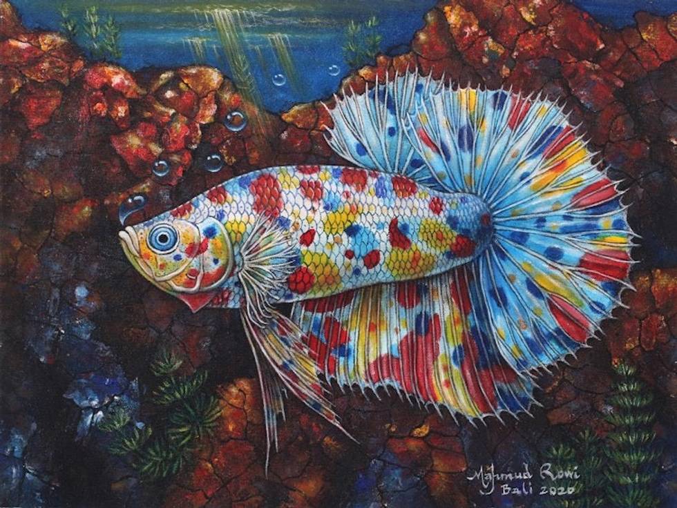 Signed Original Rainbow Betta Fish Painting from Bali 'Spiky Rainbow Betta' Item ID: 2669889315