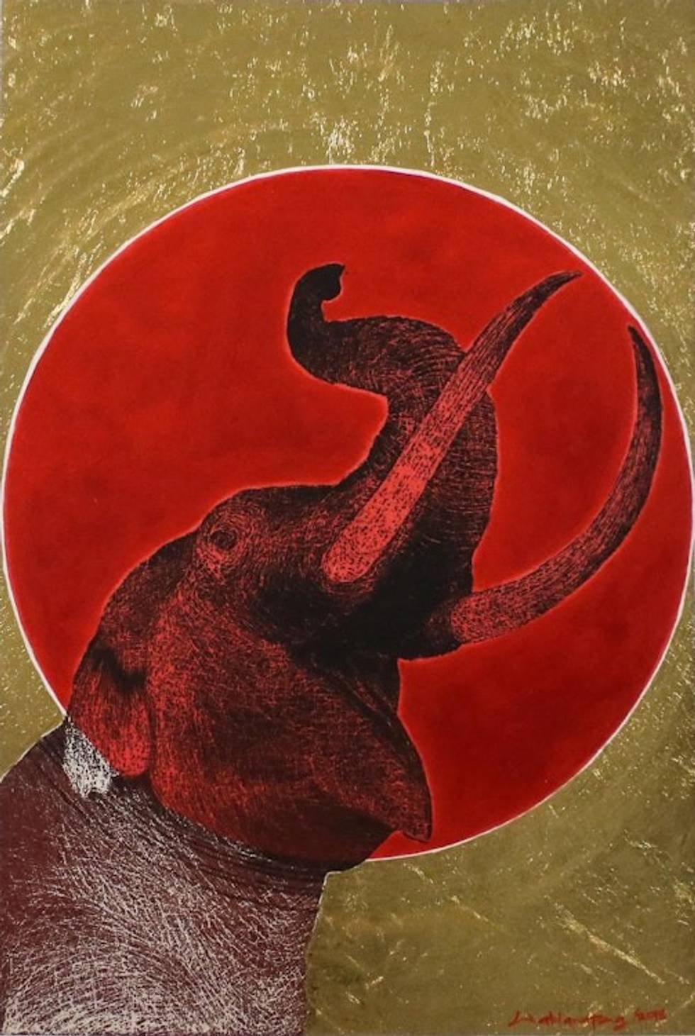 "This painting is part of Thai artisan Det's concept 'Elephant beauty from my mind.' Against a stark red sun in a vertical composition, an elephant in black and white with realistic details raises its trunk towards the sky. Det reflects on how the sun strikes happiness in humans and elephants alike, surrounding the red sun with gleaming gold foil."