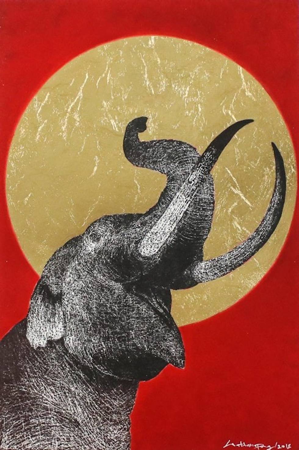 Signed Painting of an Elephant with a Golden Sun 'Be Glad II' Item ID: 2669889090