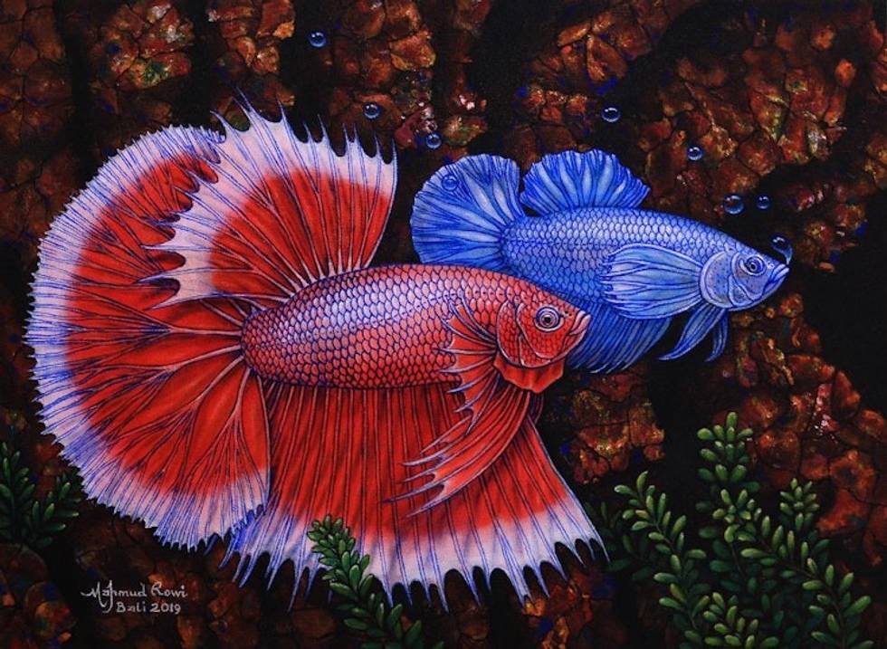 Signed Painting of Red and Blue Betta Fish from Bali 'A Couple of Mature Betta Fish' Item ID: 2669889538