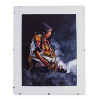 "Angel del Palacio illustrates this moody scene of a Maya woman deep in prayer and surrounded by the smoke of copal incense as she makes an offering. As is customary in Chiapas, she wears her long hair in braids, and her traditional huipil blouse, skirt and belt are woven by hand. The Mexican artist uses the gouache technique for this evocative portrait. The painting is mounted on a pinewood stretcher and covered with a protective pane of glass.