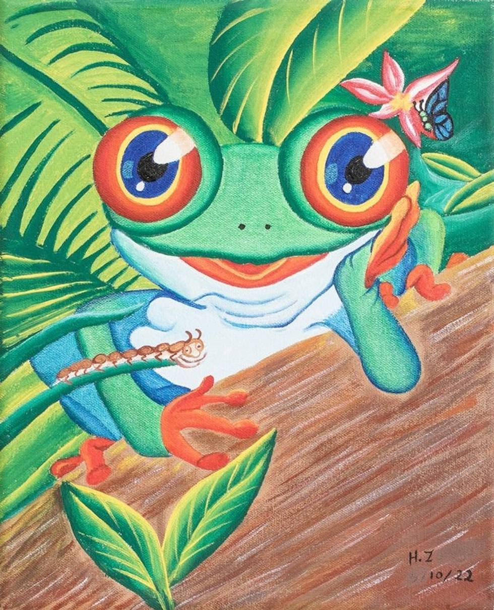 Signed Stretched Acrylic Naif Painting in a Vibrant Palette 'Frog' Item ID: 2671770107