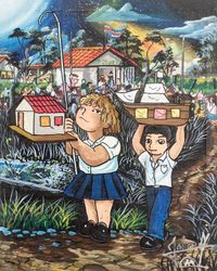 Signed Stretched Acrylic Naif Painting of Kids and School 'Lanterns' Item ID: 2671770407