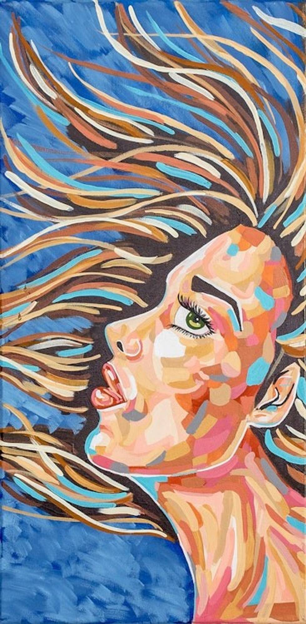 "A vibrant woman expresses herself in unique and authentic ways, letting her inner self take over the world. Painted by hand in Costa Rica, Dania Morales's acrylic painting features an expressionist style to portray a poetic image of the modern woman: courageous to overcome any challenge and free to express her true spirit.