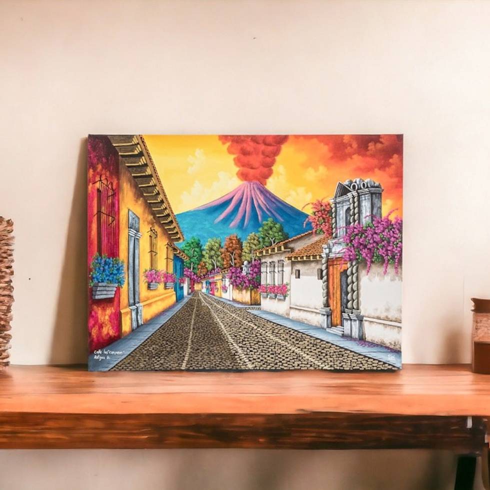Signed Stretched Oil Painting of Colorful Street and Volcano 'Las Campanas Street' Item ID: 2671772257