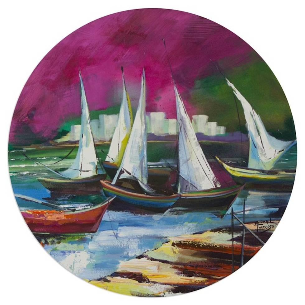 "A round canvas creates the illusion of a porthole window through which one can espy sailboats lulling in the tranquil sea in Cabo Frio, in the Lagos region of Rio de Janeiro. Anna Trancoso paints with a palette of intense acrylic colors to create a composition of maritime artistry.