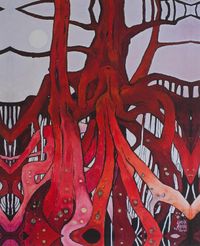 "Printed on canvas, vibrant roots of red that fade to pink reach below the ground toward the water in this stunning surrealist composition by Mexico's Georg Rauch. The artist imagines a universe parallel to our own, where familiar objects may take strange colors and forms. Small dots of shining gold appear at the bottom of the roots, completing this unforgettable piece. Georg's wife, Phyllis Rauch, presents this giclee in honor of her husband's memory."