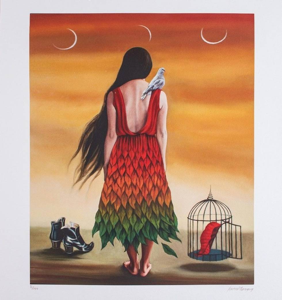 "Standing next to a pair of Victorian-era boots and a bird cage with a red wing, a girl faces a trio of crescent moons with a bird resting on her shoulder. Mexican artist Laura Villanueva creates this stunning limited-edition surrealist giclee print.