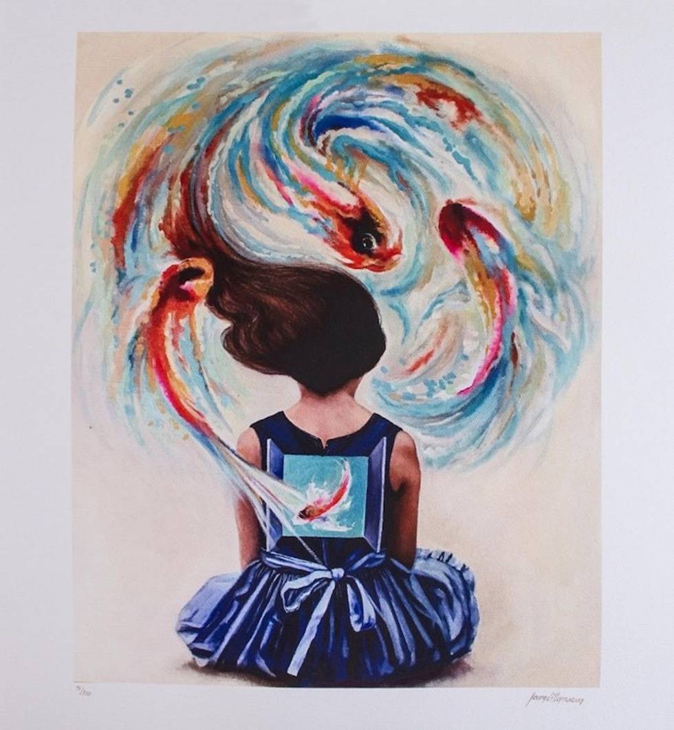 "Swirling in the ether, a group of koi fish is watched by a girl in a blue dress in this limited-edition surrealist print by Mexican artist Laura Villanueva. A box containing a koi fish is on the girl's back, seemingly where the floating koi fish came from.