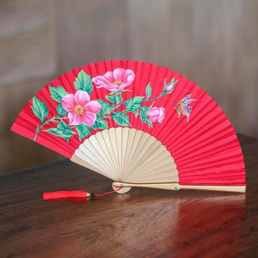 Silk and Wood Fan with Floral Motifs on Crimson Indonesia 'Empress Garden in Crimson' Item ID: 2669891868