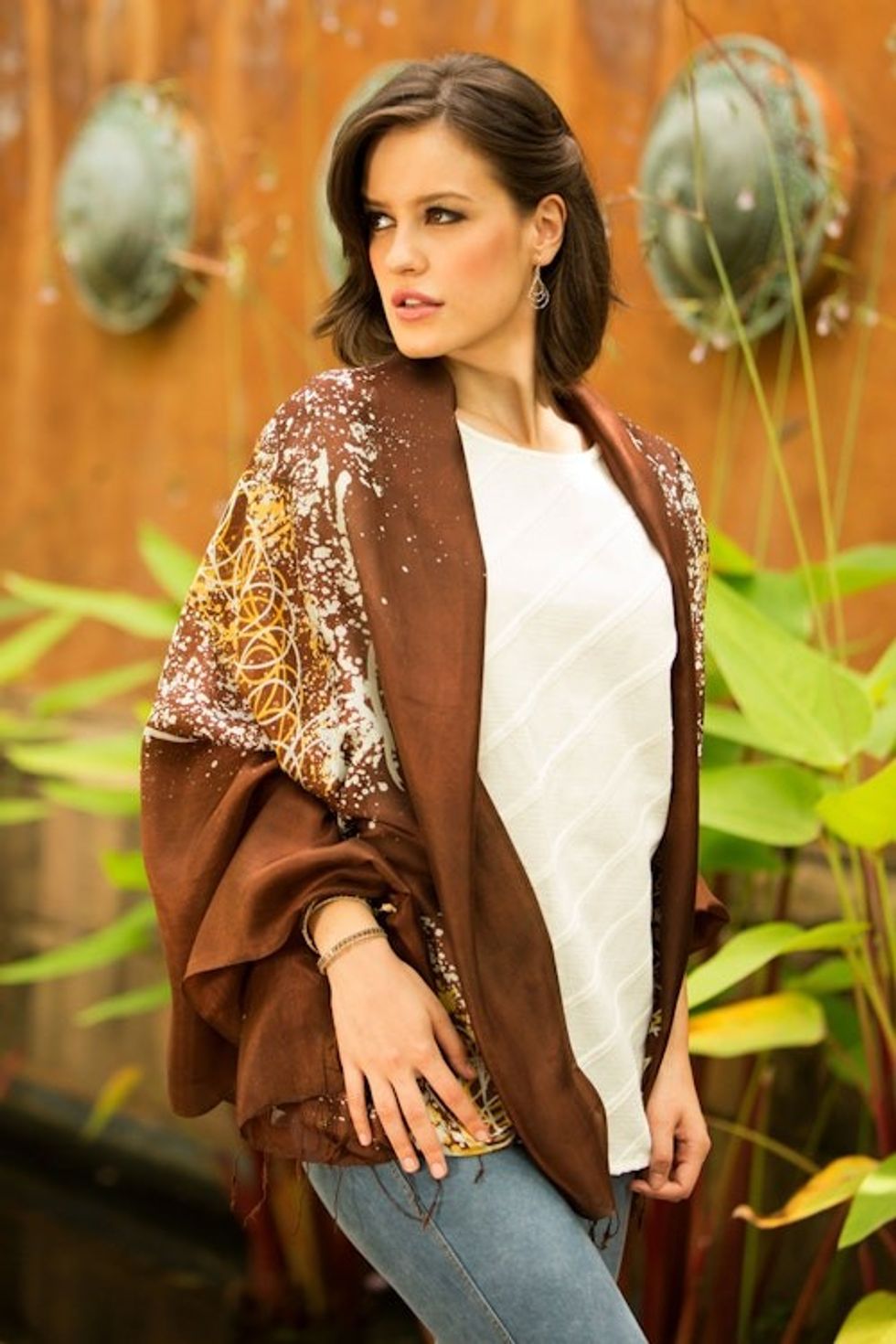Silk Batik Shawl in Brown and Yellow from Thailand 'Fireworks on Brown' Item ID: 2671802675