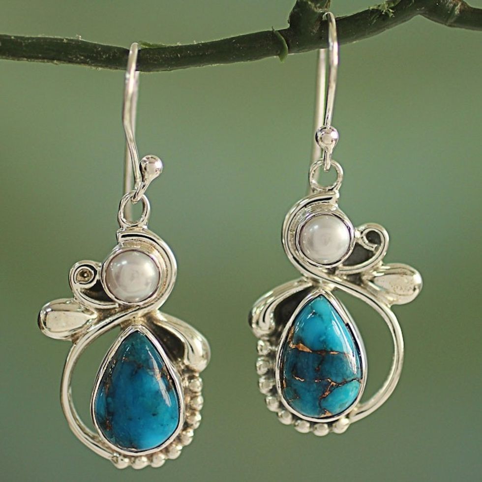 Silver 925 Cultured Pearl and Composite Turquoise Earrings 'Joyous Blue Sky' Item ID: 2669956088
