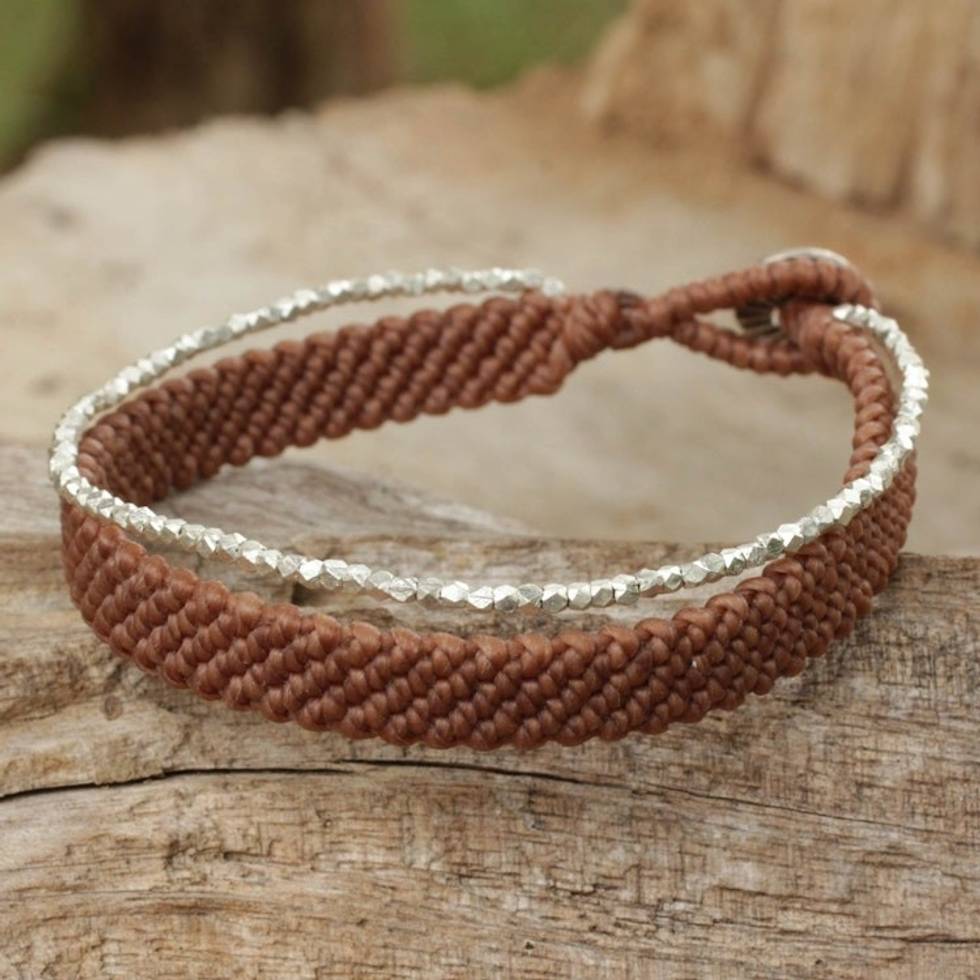 Silver 950 Hill Tribe Beaded Brown Cord Bracelet 'Blithe Brown' Item ID: 2671802086