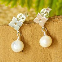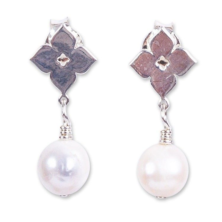 Silver and Cultured Pearl Flower Dangle Earrings from Mexico 'Moroccan Flowers' Item ID: 2671808416