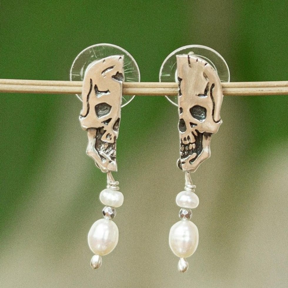 Silver and Cultured Pearl Skull Dangle Earrings from Mexico 'Skull Pearls' Item ID: 2671808367