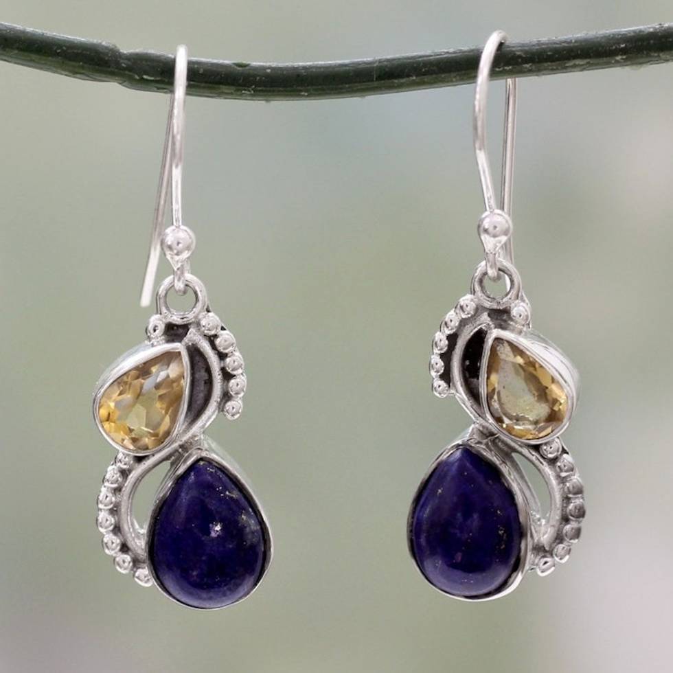 Silver and Lapis Lazuli Earrings with Faceted Citrine 'Two Teardrops' Item ID: 2671619363