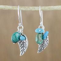 "Lively leaves are crafted of 950 silver by Karen hill tribe artisans, dangling from the ears with a truly fashionable look. Accentuated with blue-green pieces of reconstituted turquoise, these fascinating earrings are presented by Thailand's Withaya Cheunjit. They adorn the wearer on hooks of sterling silver."