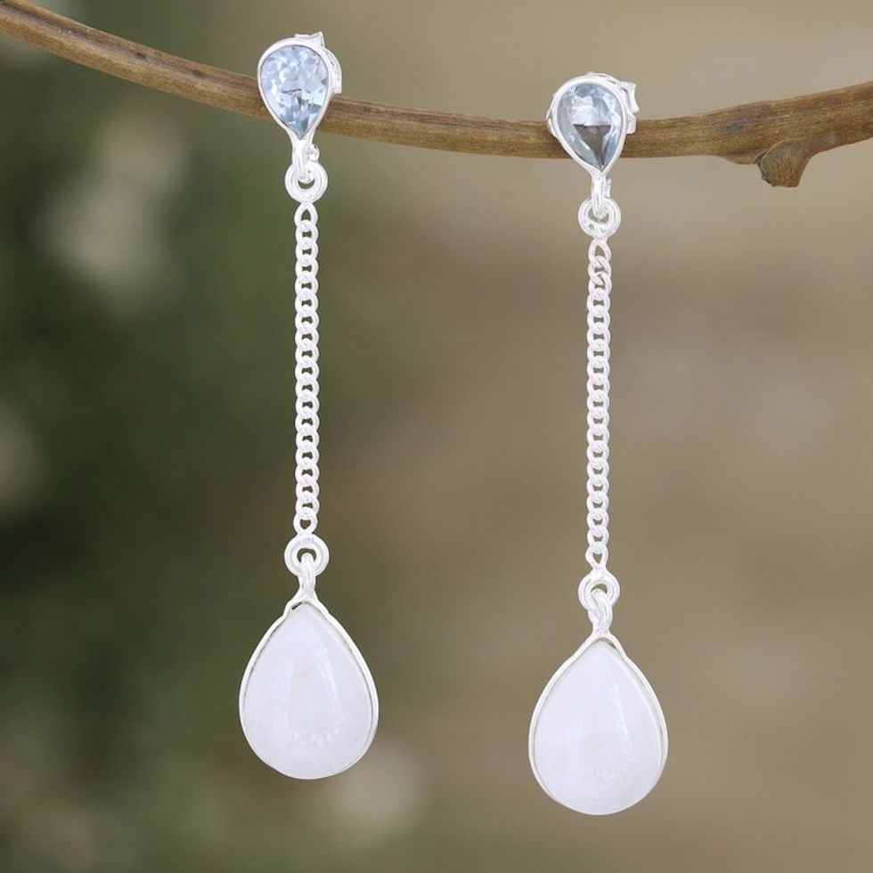 Silver Dangle Earrings with Rainbow Moonstone Blue Topaz 'Simply Chic' Item ID: 2671786865
